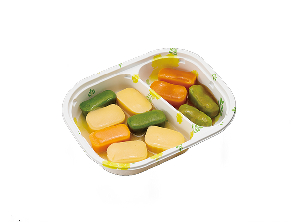 舌でつぶせるかたさのムースのお弁当です。