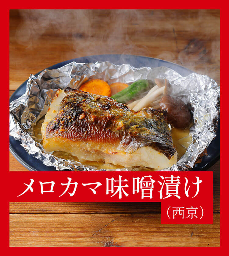 幻の高級魚メロのカマ部分を味噌漬けに。メロカマのジューシーな脂と味噌のほのかな塩味と甘みとは相性抜群。家庭で上品な西京焼きを堪能できます。