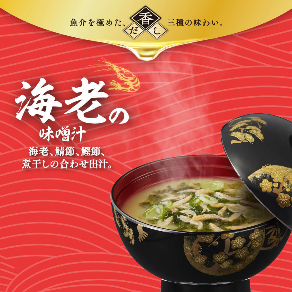 米みそ(国内製造)、青ねぎ、えびエキス調味料、でん粉、干しえび、えびだし、昆布エキス、煮干粉末、さば節粉末、酒、みりん、焼きのり、かつお節粉末、粉末小麦発酵調味料、発酵調味液、えびパウダー、うにペースト調味料、かつお節エキス、かにエキス/調味料(アミノ酸等)、酸化防止剤(V.E)、香料、(一部にえび・かに・小麦・さば・大豆を含む) |