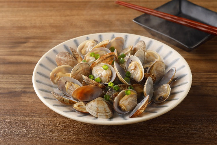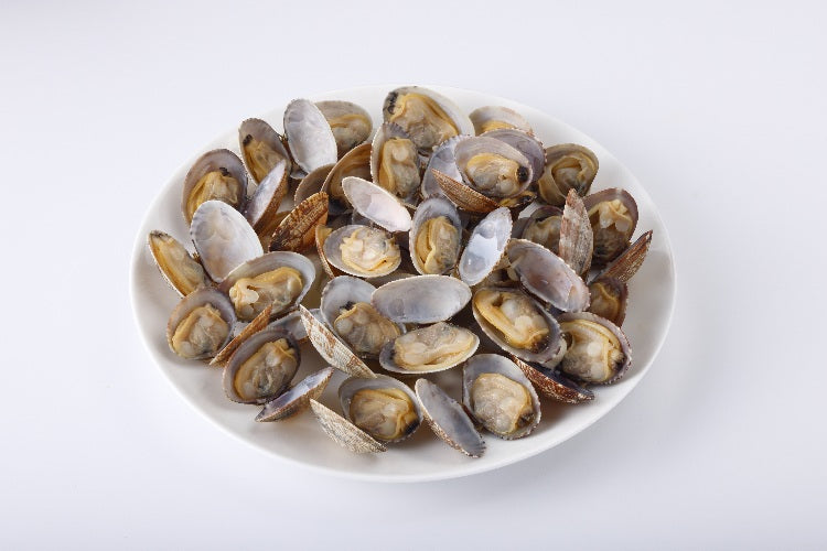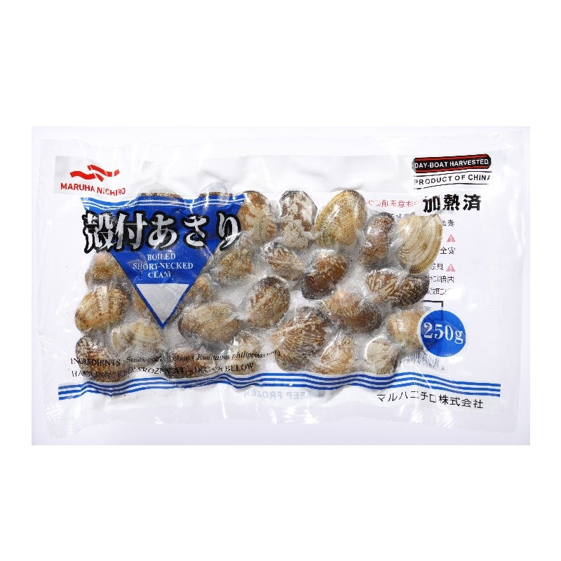 活きたアサリを砂抜きし、そのまま袋詰めし、ボイル加熱しました。旨味たっぷりです。