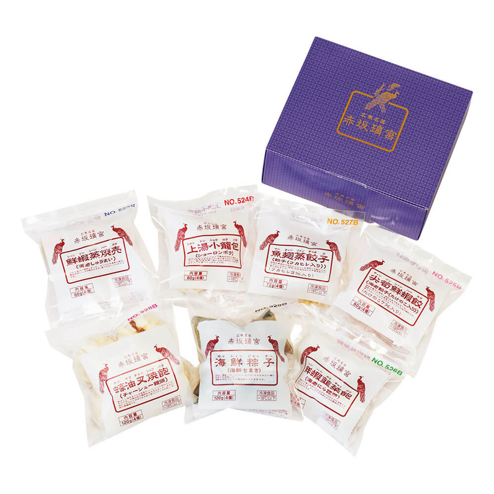海鮮ちまき120g(4個)、チャーシュー饅頭120g(4個)、海老にら饅頭96g(4個)、海老餃子たけのこ入り80g(4個)、海老しゅうまい80g(4個)、ショーロンポウ80g(4個)、ふかひれ入り餃子72g(4個) |