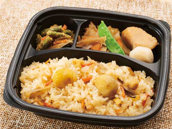 ほくほくの栗を炊き込んだおこわに、鶏肉と野菜の煮物、ごま和えをセット。