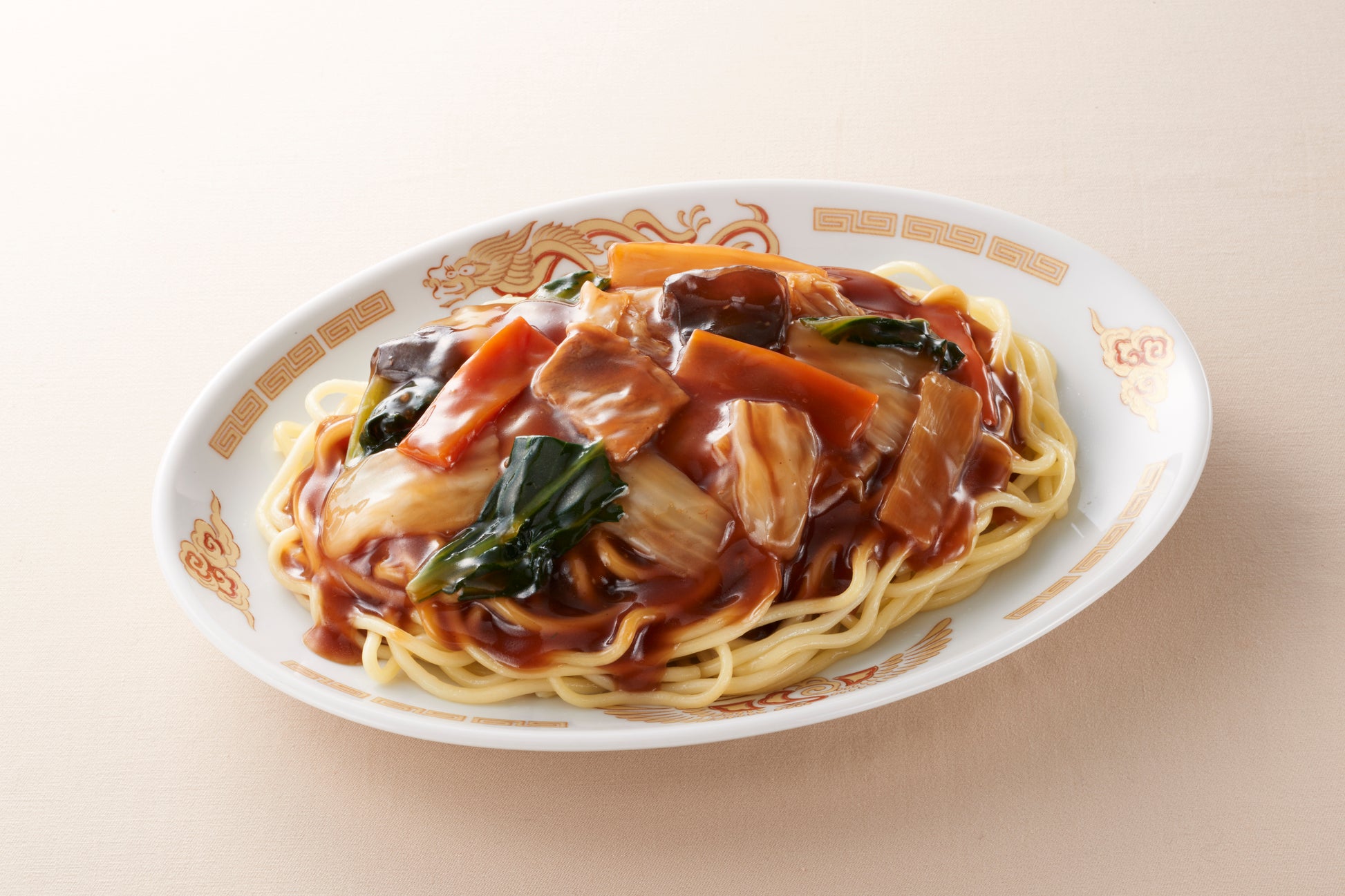 オイスターソースが特徴の自家製あんと、豚もも肉・白菜・人参・たけのこ・きくらげ・チンゲン菜の6種の具材が入ったあんかけ焼そばです。